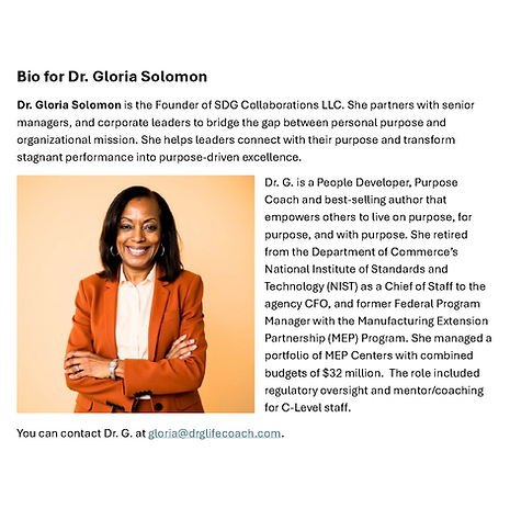 Join us for a powerful Zoom presentation with Dr. Gloria Solomon, leadership expert, People Developer, Purpose Coach, best-selling author, and founder of SDG Collaborations LLC.
